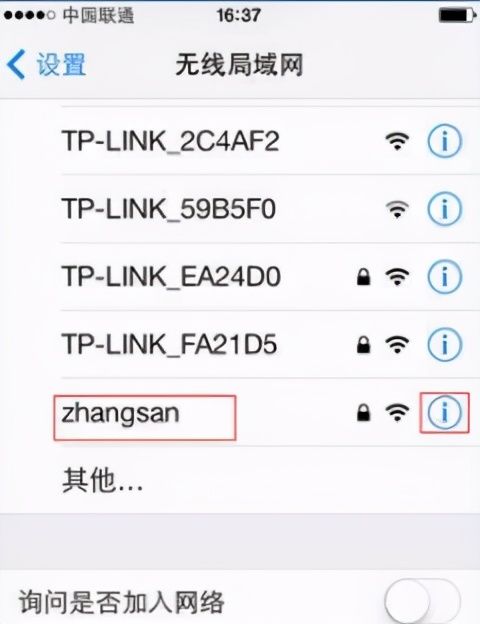 在 无线局域网(或Wi-Fi)设置菜单,点击对应无线信号后面显示的 蓝色感叹号 的图标,如下图所示: