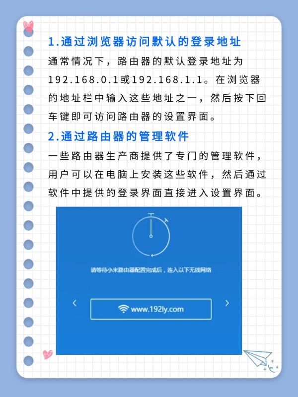 进入路由器设置界面有几种不同的方法,可以通过浏览器访问默认的登录地址、路由器的管理软件、手机应用程序或物理连接。