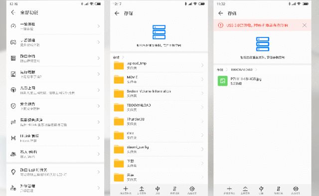 接着来接入外在存储设备,连接后可以将照片、视频等资源放到 USB 存储设备中,并将其连接到路由器,可随时查看,视频支持在线观看。如果开启文件共享服务后,家人只要连上路由器的网络,就都能通过各自的手机、平板、电脑、盒子来查看这些照片和视频了,非常实用的功能。