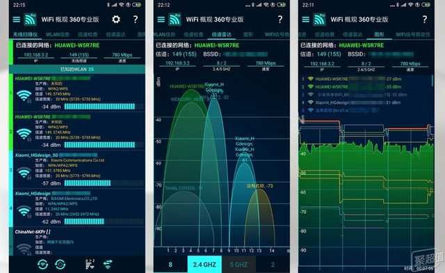 通过专业APP软件测试了下路由器的信号和稳定性, 从图中可以看到荣耀Pro2路由器的信号非常好和信道的稳定性表现优秀,WIFI信号一般在-28dBm至-40dBm左右,数值越小信号越好。