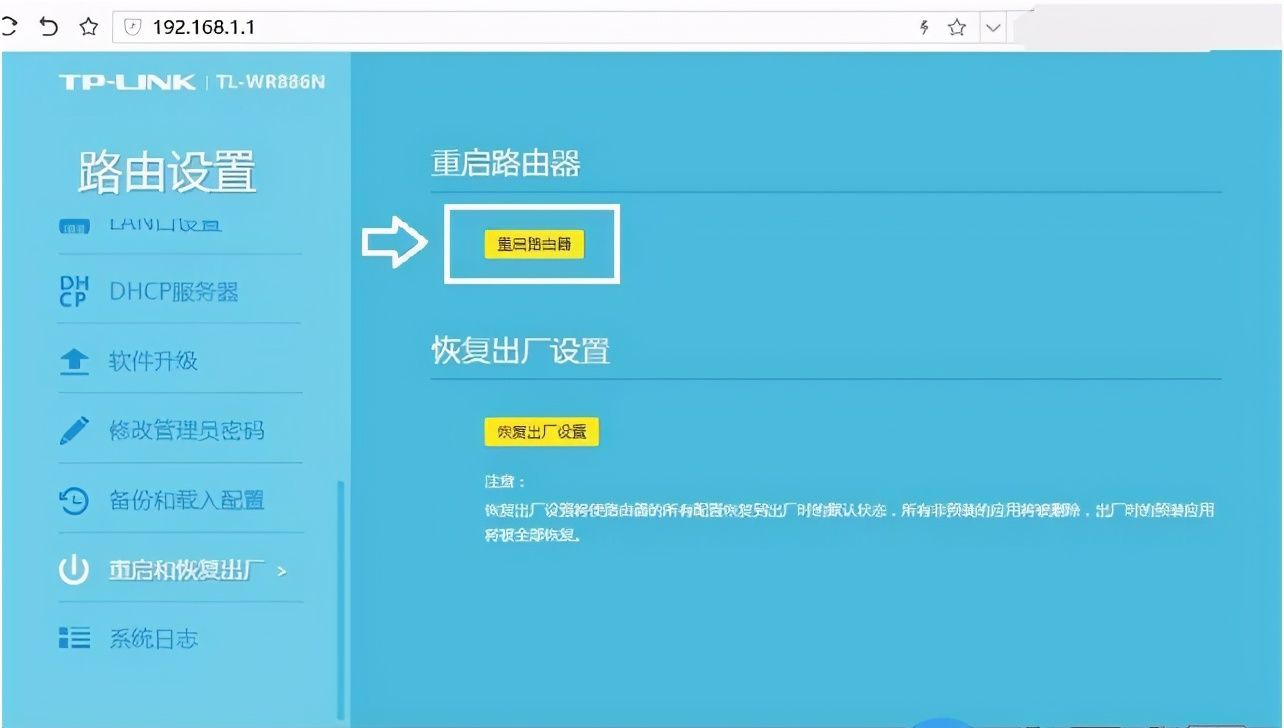 tplink路由器的重启位置大同小异,如下图,进入设置界面后,点击路由器设置,然后点击重启和恢复出厂,点击重启路由器即可。