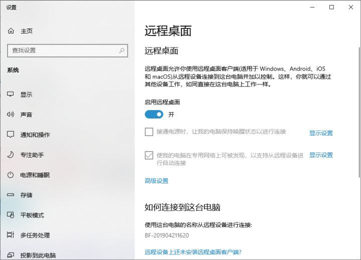 开机以后,当然是希望远程设置,有一些第三方软件可以使用,其实Windows自带的远程桌面就很好用,在Windows 10中,可以在控制面板中找到“远程桌面”的设置选项,勾选开关即可开启本机的远程桌面功能。
