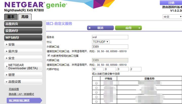 服务名随便填,协议:TCP/UDP,外部端口组 和 内部端口组 一致即可,内部 IP 地址映射到家里电脑的 IP。