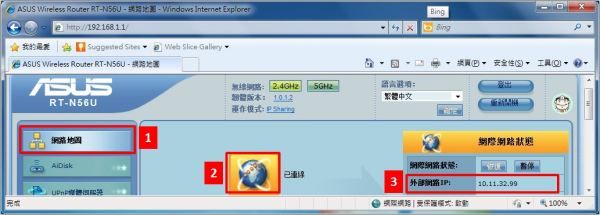 首先点击「网络地图」,再点击「已联机」的图示,最后即可查看「因特网状态」中的「外部网络IP」信息。