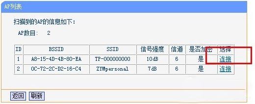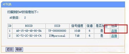 3、接下来,我们点击“扫描”,然后无线路由器自动会搜索到周围的无线路由器的信号,将搜索到的无线路由器展示在列表中,我们选择好准备进行桥接的无线路由器,然后点击“连接”。