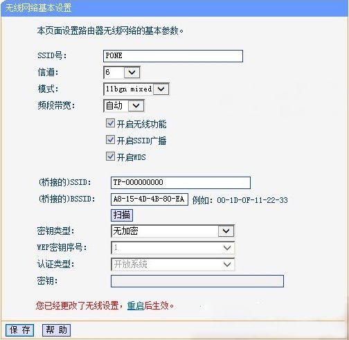 4、接下来,路由器自动返回到无线设置界面,我们已经可以看到桥接的无线路由器的SSID名称,就是与我们的路由器桥接的那个无线路由器,这时候,我们还可以进行一些相关的加密设置,这个时候,大家自己进行设置吧。