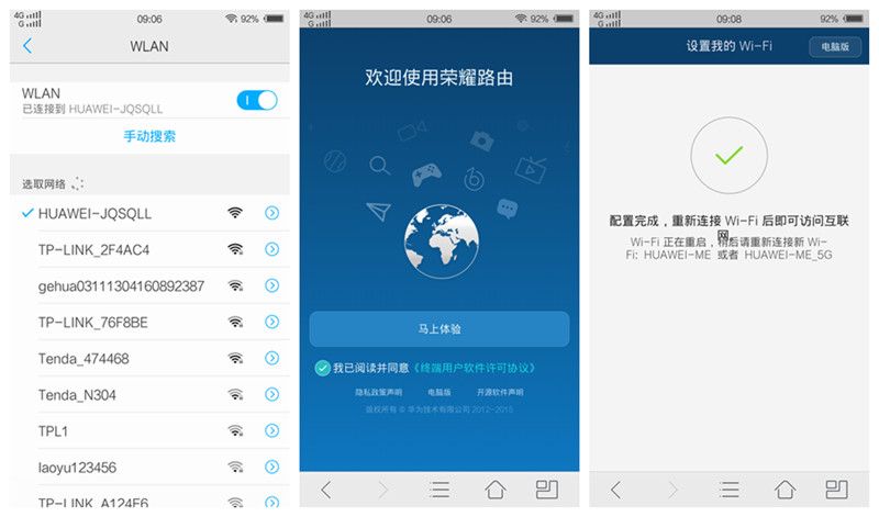 手机浏览器会自动就跳转到设置向导,在展会环境下自动获取IP地址(DHCP),不需要任何复杂配置,仅需要设置好Wi-Fi名称和密码重启就能上网把名字改成HUAWEI-ME,设SN密码,连接这个热点,网就这样通了,才发现根本没和我要电信的账号和密码,这么快就给我破解了吗?确实非常省心方便。