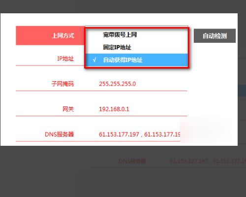 2、a\进入“WAN”设置:选择动态IP地址(有线路由器要激活DHCP)
