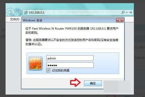 2、这时会弹出登陆框,输入用户名和密码(默认的讯息可以在路由器背后查到,一般都是admin)→确定。