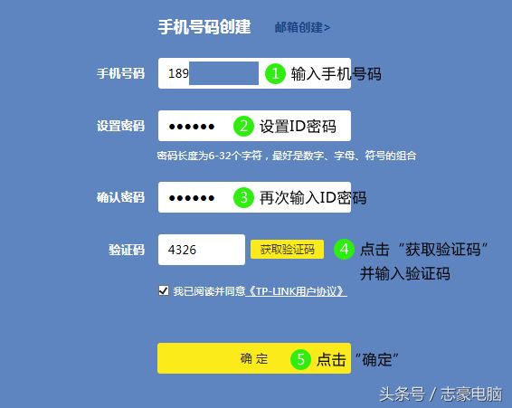 根据提示输入手机号码,并设置TP-LINK ID的登录密码。如下图: