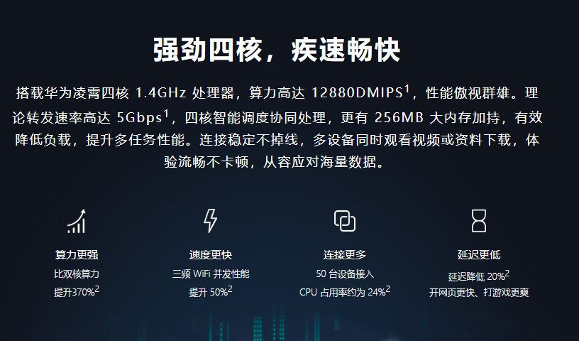 现在很多路由器企业,把自家的CPU作为宣传的亮点,实际上建议如果你家是百兆以上的宽带,选择4核以上的CPU是最好的,至少也要是双核,单核CPU不可能压的住这么高的转发性能。