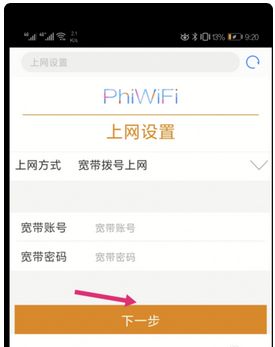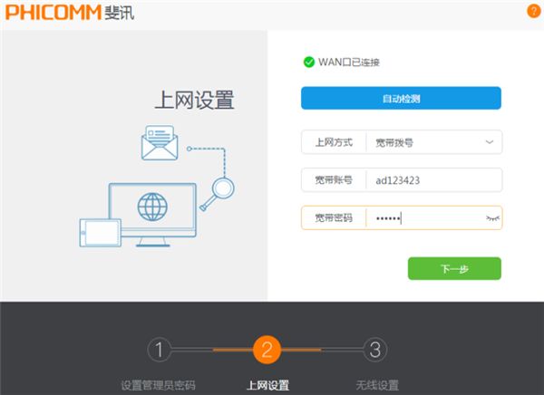 5、点击后,路由器会自动检测上网方式,一般需要检测15秒左右,检测联网方式后,会跳转到上网配置页面。根据页面提示,输入自己的宽带账号和密码。如果不知道宽带账号和密码,可以拨打宽带的客服电话咨询。输入后,点击页面的“下一步”,如下图中所表示。