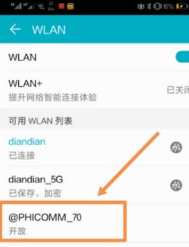 3、由于路由器未设置,所以这时斐讯路由器正面的指示灯为红色。我们打开手机的wlan,在wlan列表中找到“@PHICOMM”这个开放的wifi信号,点击信号进行连接,也可以使用笔记本电脑进行连接,如下图中所表示。