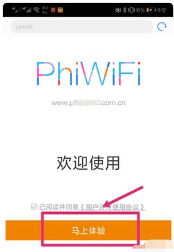4、连接该热点后,因为没有进行路由器设置,是无法上网的。这时,我们打开手机浏览器,输入斐讯浏览器的管理地址。输入后,进入路由器后台管理的欢迎界面,我们点击“马上体验”,如下图中所表示。