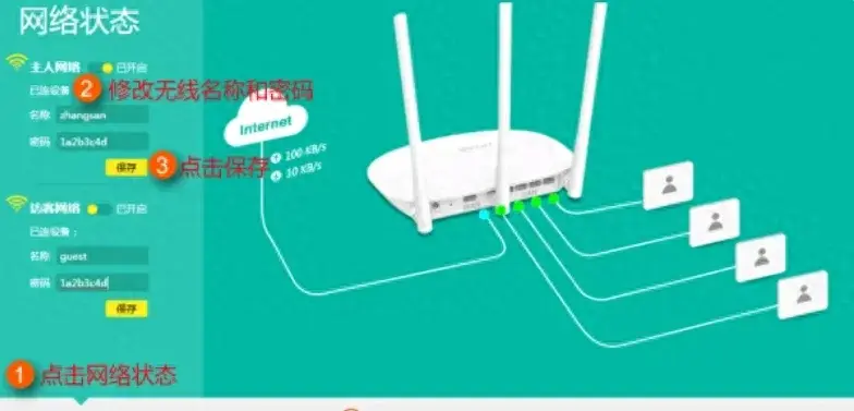 登录路由器设置界面,点击“网络状态”,可修改相应的无线名称及无线密码,并点击“保存”。如下图: