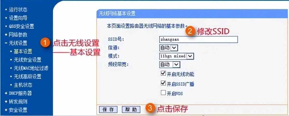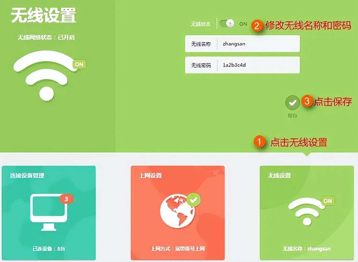登录路由器设置界面,点击 “无线设置”,可以修改相应的无线名称和无线密码,并点击“保存”,如下图: