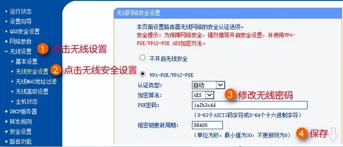登陆路由器界面,请点击“无线设置” >> “无线安全设置”,找到WPA-PSK/WPA2-PSK,修改PSK密码中的密码设置为不少于8位的密码,并点击 “保存”。如下图: