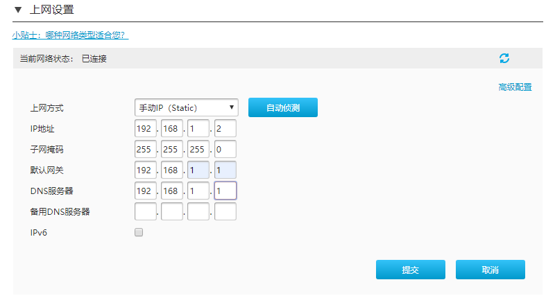 静态ip,在路由模式下我们其实很少使用静态IP来进行网络连接,但是这依然是一个可行的连接方式,路由器连接光猫后,进入配置界面,选择静态ip,可以输入IP地址192.168.1.2、子网掩码255.255.255.0,、网关192.168.1.1,DNS服务器地址192.168.1.1,保存设置,重启路由器就可以正常使用网络了。