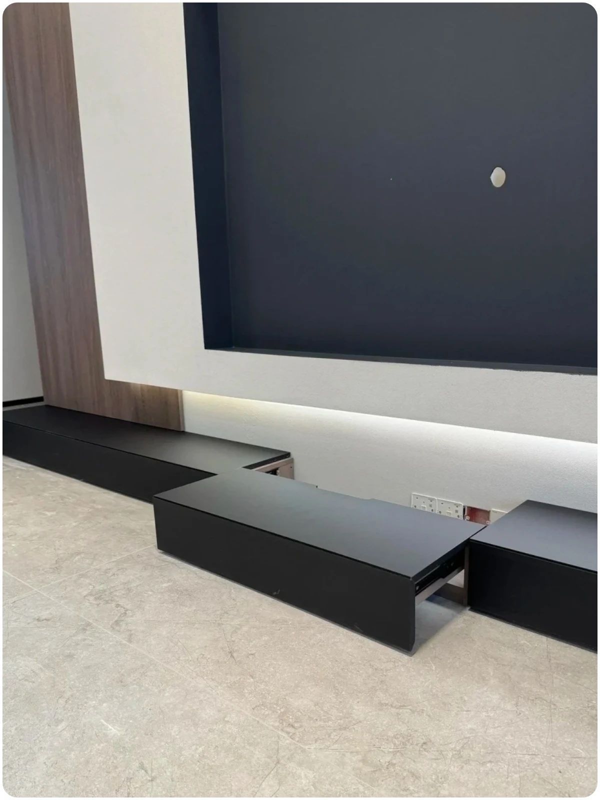 ▲落地电视柜可以用来放置路由器,也可以做成抽拉式的,方便插座的安装。同时在柜子后面预留散热口,以保证设备的正常运行。