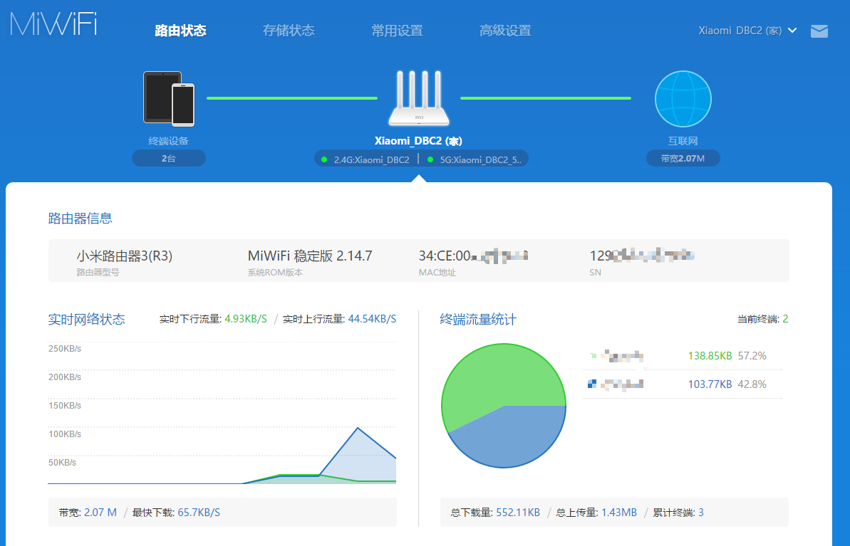 小米路由器3后台的主页也十分清晰地展示了有关路由器的信息,包括路由器的状态、网络状态、连接的设备等等。数据颇多但排版良好,没有杂乱的感觉。