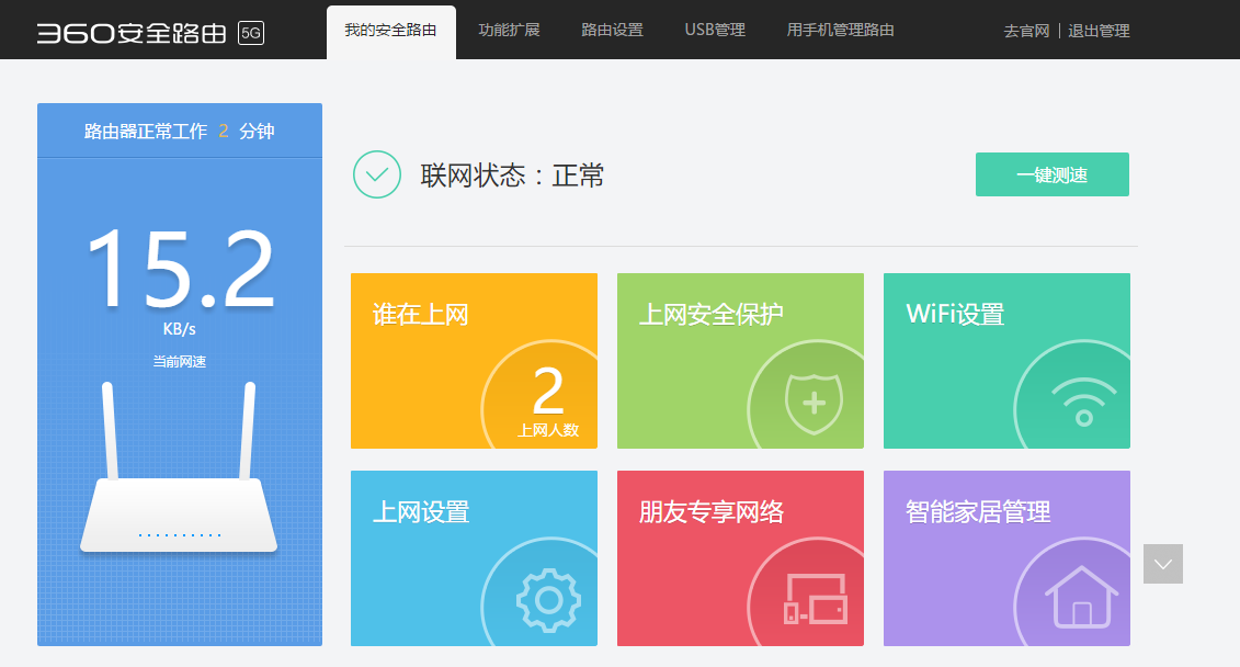 相比之下,360安全路由P2在首页则没有太多的信息展示,更多的是功能按钮的呈现。不过常用的上网设置、WiFi设置等首页都有明显的按钮引导,减少了用户寻找带来的繁琐。