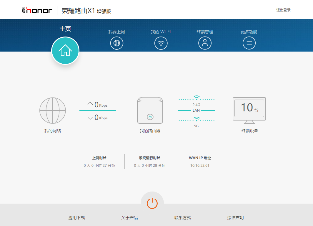 在后台的配置页面上,荣耀路由X1增强版也将外在的简洁延续至此。首页展示了路由器的运行情况及网络状态。常用的实时速率、Wi-Fi状态及路由重启都能在主页完成。同时,荣耀路由X1增强版还将使用频率高的WAN设置、Wi-Fi设置、设备管理单独成一级菜单,功能的命名也十分口语化,这应该是我第一次遇到将WAN设置亲切称为“我要上网”的路由器了。