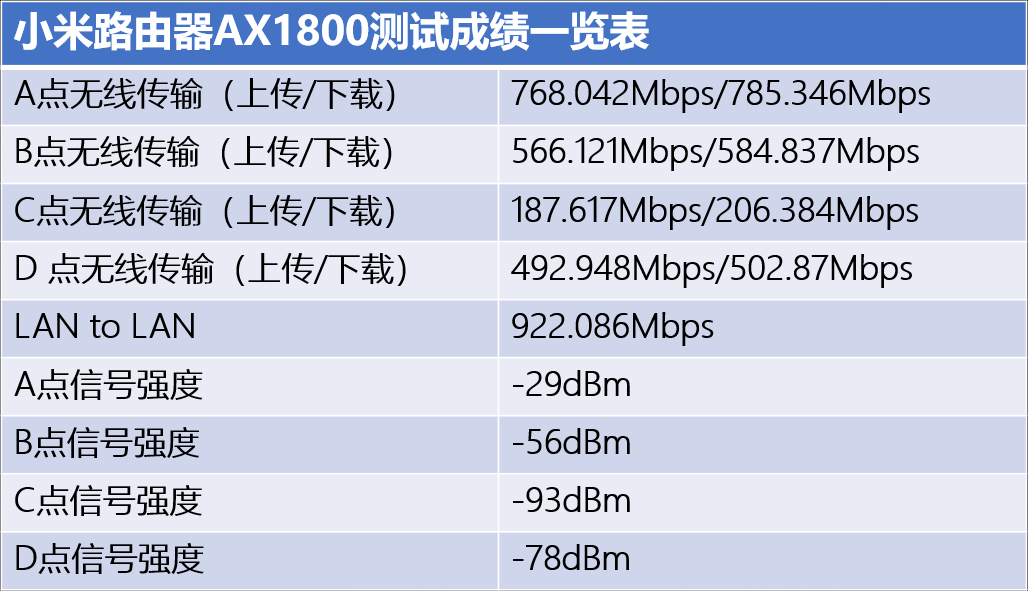 本次测试我们重点考察了小米路由器AX1800在5GHz频段下的传输性能。从测试结果来看,在近场传输性能上,小米路由器AX1800的传输速度达到760Mbps以上。当信号穿墙之后,距离路由器约3米(隔一堵墙)的B点也能获得560Mbps的传输速度,该测试点的信号强度为-56dBm。此外在信号穿过两堵墙的C点,我们的测试结果显示这款路由器的传输速度也达到180Mbps以上,Wi-Fi信号强度为-89dB。综合小米路由器AX1800的测试成绩来看,这款路由器的性能表现较好,能够满足普通家庭用户的日常使用需求。
