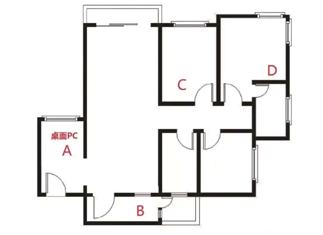 在性能测试环节,我们使用一台桌面PC与路由器建立千兆有线连接组成服务器端,与路由器建立无线连接。另一台同样拥有相同无线规格的笔记本(客户端)与路由器建立无线连接,在各个测试点之间转换。其中,A点距离路由器约1米(无障碍),B点距离路由器约3米(隔一堵墙),C点距离路由器约5米(隔两堵墙),D点距离路由器约10米(隔一堵墙)。
