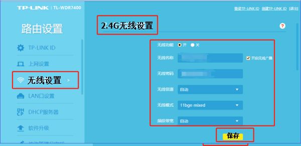 5.返回“路由设置”,进入“无线设置”。如图选择“2.4G无线设置”,按要求填写你想要设置的“无线名称”和“无线密码”,将“无线信道”和“频段带宽”设置成“自动”,再点击“保存”即可。