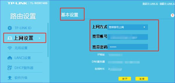 3.在左边“路由设置”菜单栏中选择“上网设置”,在“基本设置”中把“上网方式”选择为“宽带拨号上线”,再输入你的“宽带账号”和“宽带密码”。