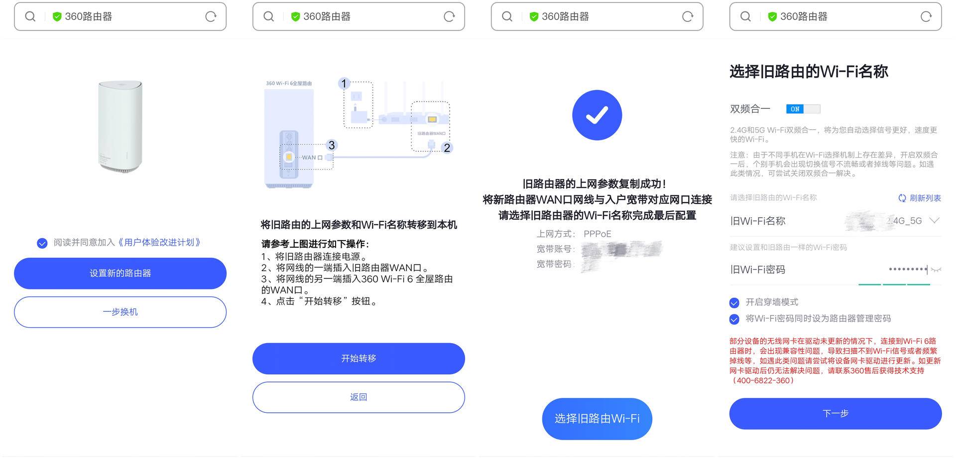 之前买过的大部分路由器联网,都需要单独输入宽带账号密码进行网络初次设定,而这款360全屋路由器则可以通过一步换机简便快捷的完成网络设定!