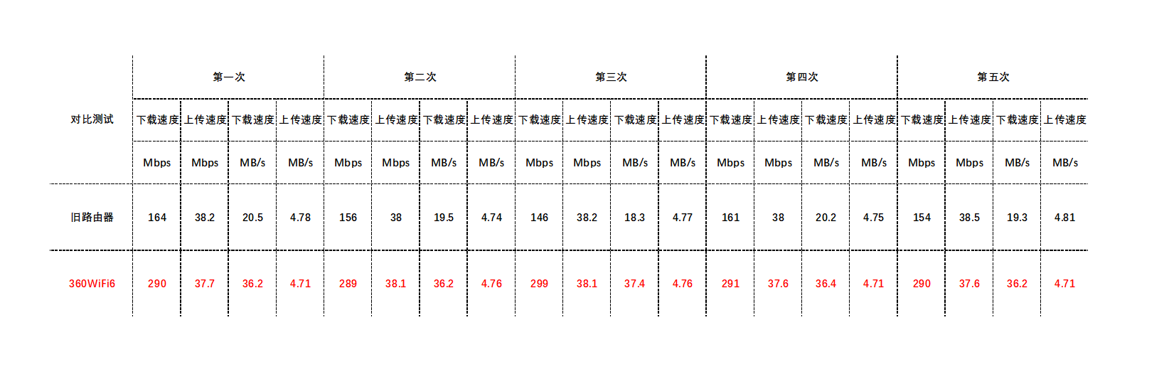 从统计表中可以看出,在非WiFi6设备的联网的情况下,360WiFi6全屋路由器较之前的旧路由下载速度提升了将近一倍。