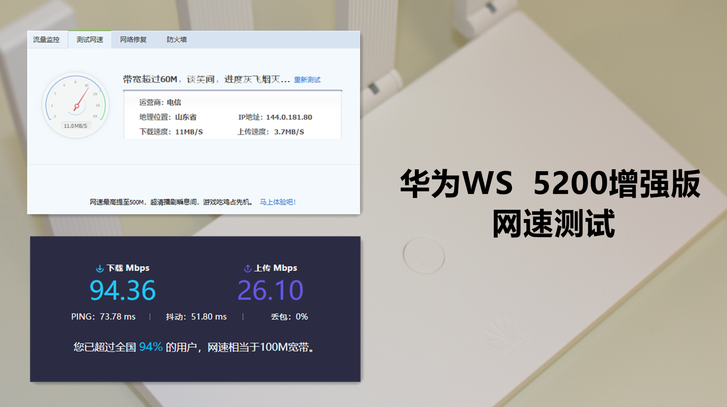 笔者还专门对网速进行了测试,先说一下笔者家里的宽带情况,100兆电信宽带,两家合用,需要无线网络的设备约20台(包含电视、手机、电脑等),以前笔者使用的斐讯路由器经常出现掉线的情况,在更换华为路由WS5200增强版之后,网络稳定,然后经过电脑端和手机的测试,网速均可达到带宽的理论下载数值,而且Ping的数值也很不错,这样表现也为以后手机玩网游提供便捷,毕竟如果手机玩游戏网络延迟太高,会影响整体的游戏体验的。