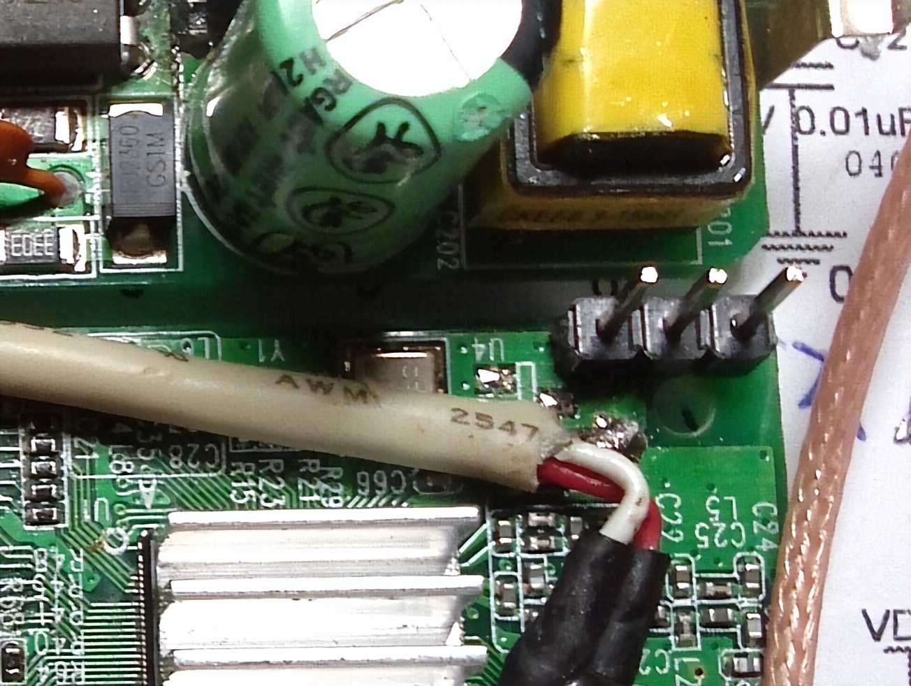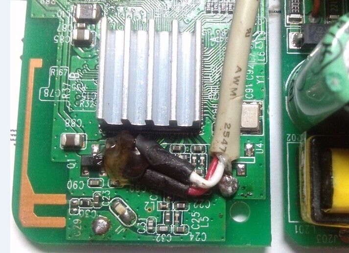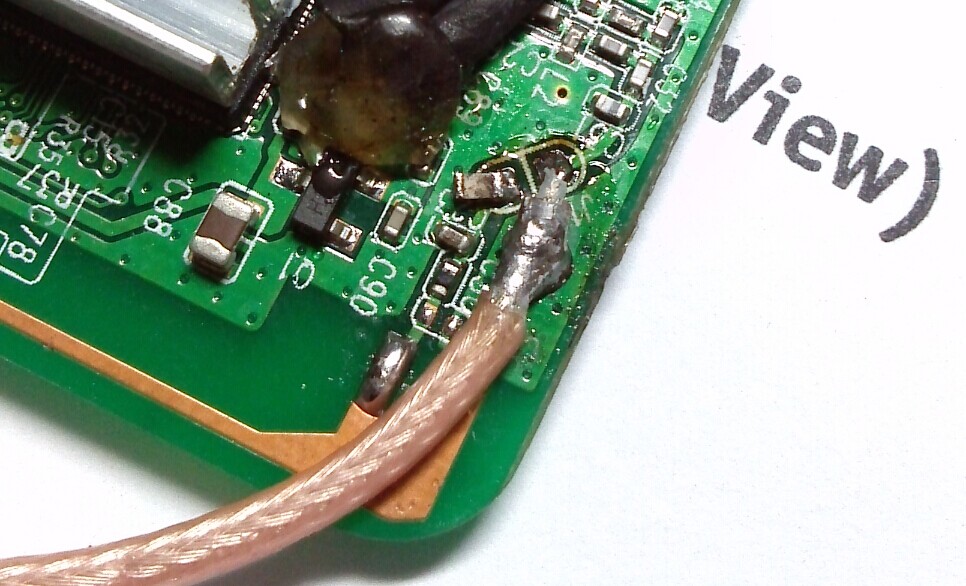 7)取约10CM屏蔽线(虽然后期需要剪掉一段,但取长不取短),先把屏蔽层焊实在数字地上面以固定住屏蔽线不乱动。取极少量热熔胶,小心将细铜丝固定在AR9331附近PCB板上,并使铜丝悬空不贴近PCB板。屏蔽线芯线套入热缩管,然后再小心加小心不要弄断了铜丝,把它们与屏蔽线芯线焊接,用烙铁热缩后,用少量热熔胶把热缩管固定在PCB板上。提醒:固定过程中烙铁要小心不要把铜丝又焊脱了!一定要掌握好加热时间!最后,给CPU(AR9331)增加散热器。