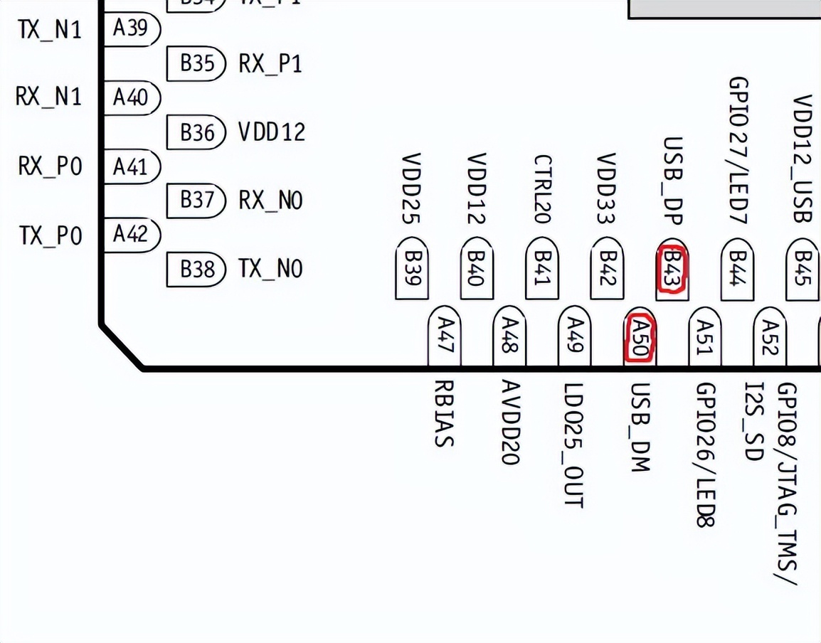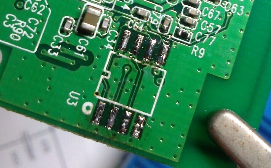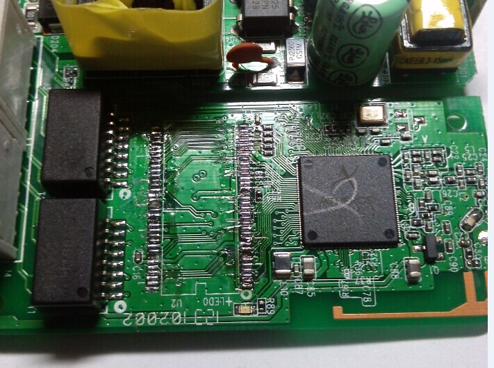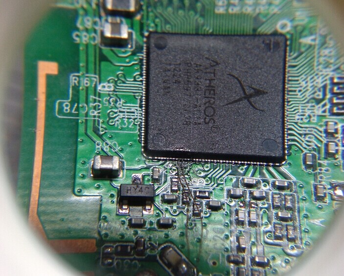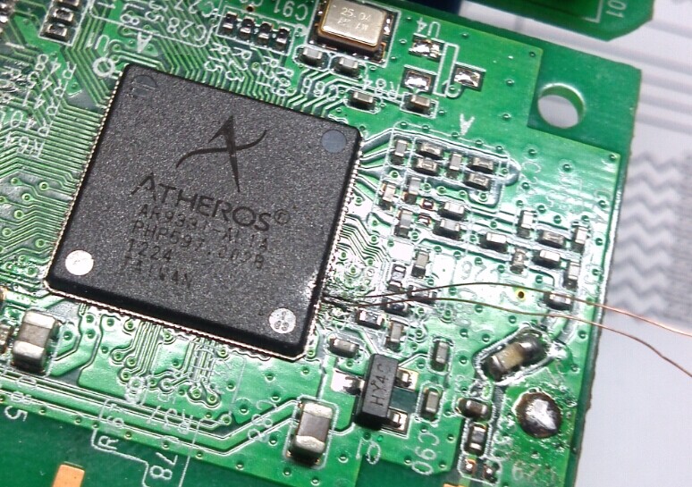 6)扩展USB挂载功能。找废旧耳机线(或者其它细铜丝,比头发还要再细好几倍的那种,而且需要软的)拆开绝缘层,剪下约5CM,抽出其中两根细芯线,上锡,用烙铁粘松香在AR9331芯片A50引脚附近熏一下,是熏一下,千万不要碰到引脚。将镀锡的细芯线接上AR9331的A50和B43引脚,这两个脚实在太细太细了,很难完成。我因为只有一个小放大镜和一把普通烙铁,来回操作了将近4个小时,才成功不虚焊、不短路,将两根比头发还细的两根线接上这两个引脚。提醒:焊完后想办法查短路,比如用缝衣针替代万用表笔。DM、DP对地电阻约500K,且阻值相同。另外,B43脚靠近B42脚,B42脚为VDD3.3V;A50脚靠近A51,A51貌似未引出使用。B43脚靠近芯片边缘,边缘引脚起第8脚,A50为第9脚。请自行查AR9331资料。