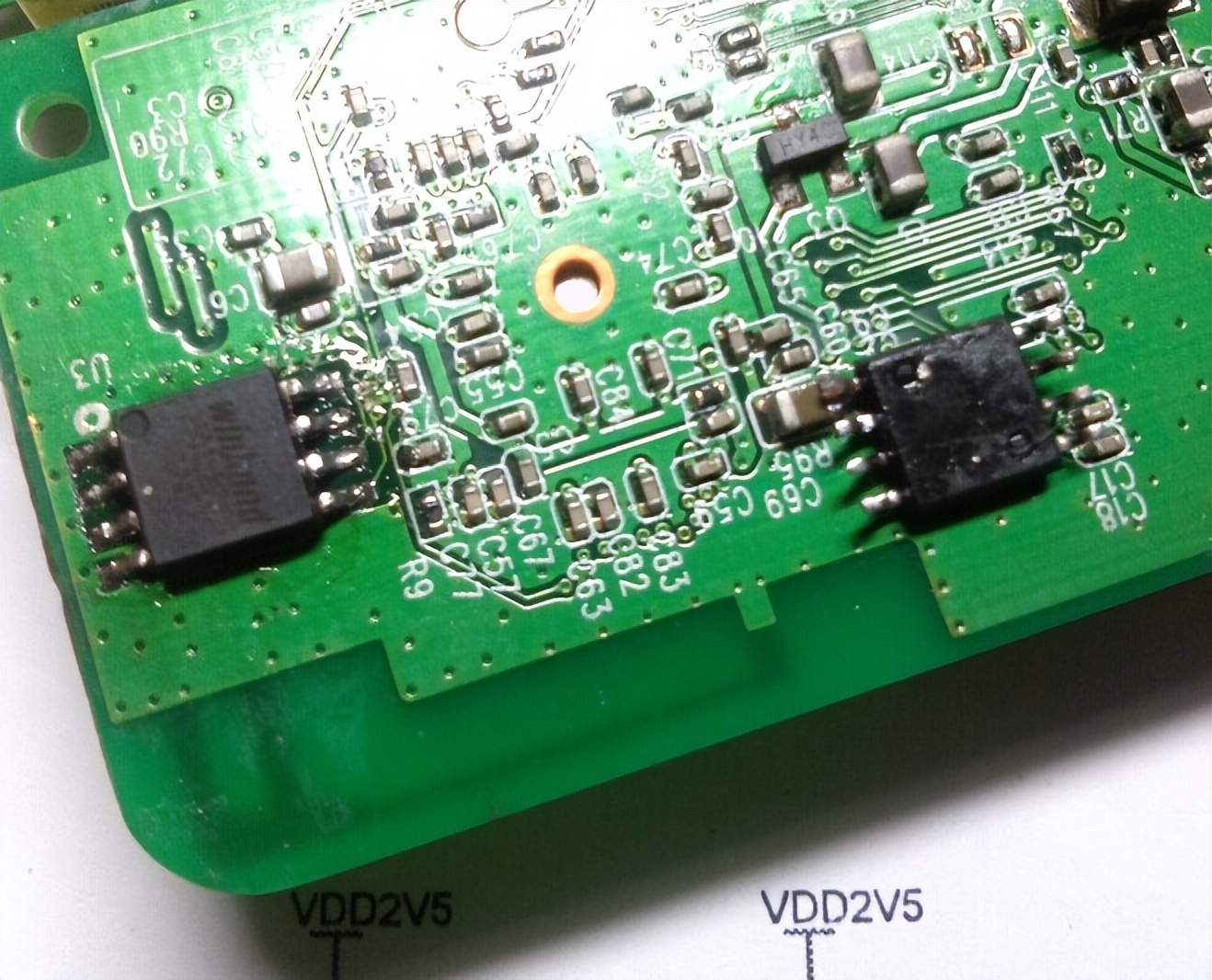 10)刚才第“4)”步提到原厂FLASH装在储物袋终究还是不保险,说不好哪天就找不见了。反正拆下来放在那里别的地方也用不上,原厂固件也还可以用。最好就像下图一样,焊在原板子上,说不定以后还用的上。