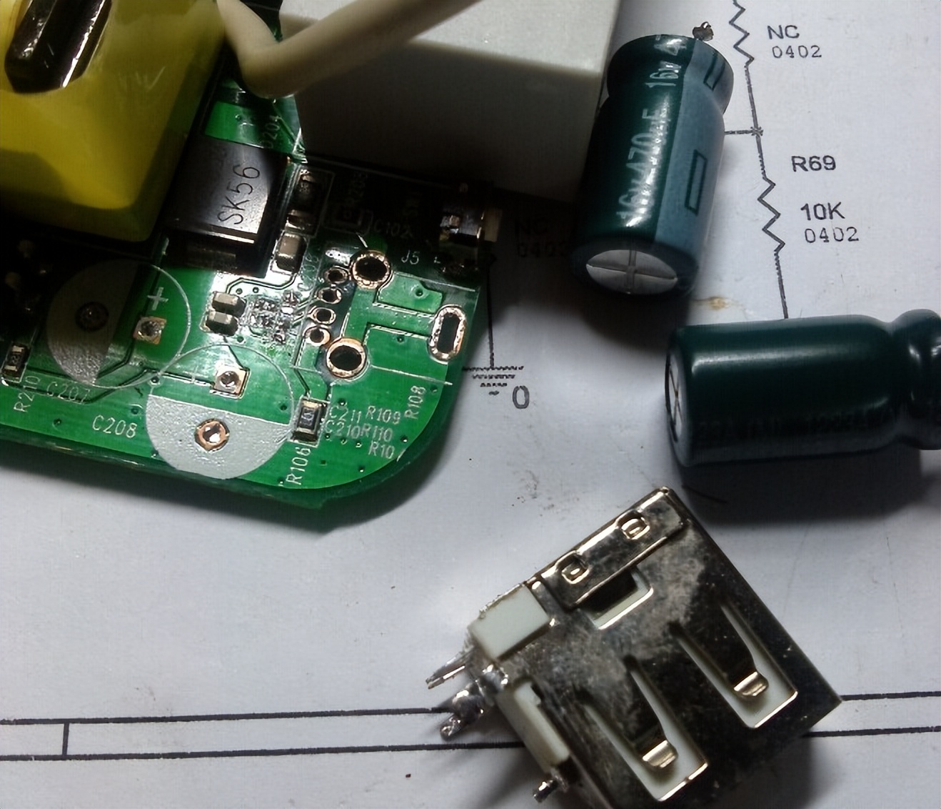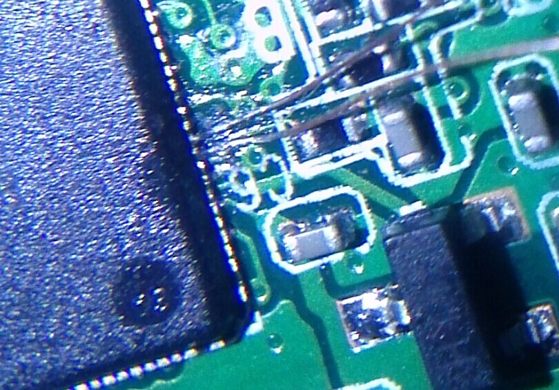8)然后是USB位置。先拆下USB附近那些挡住烙铁的元件,并把USB数据口PCB板上的充电检测电阻(60R)拆除,但需要保留下拉电阻(50K)。用50R(大致可以22R至60R一般都可以正常使用)直插1/16W电阻(我的是用两个100R并联)接入屏蔽线的另一端芯线,用热缩管套好,屏蔽层齐根剪短即可。电阻另一端先插入USB座D-、D+孔(CPU引脚B43对应D+,A50对应D-),装上USB座即可。
