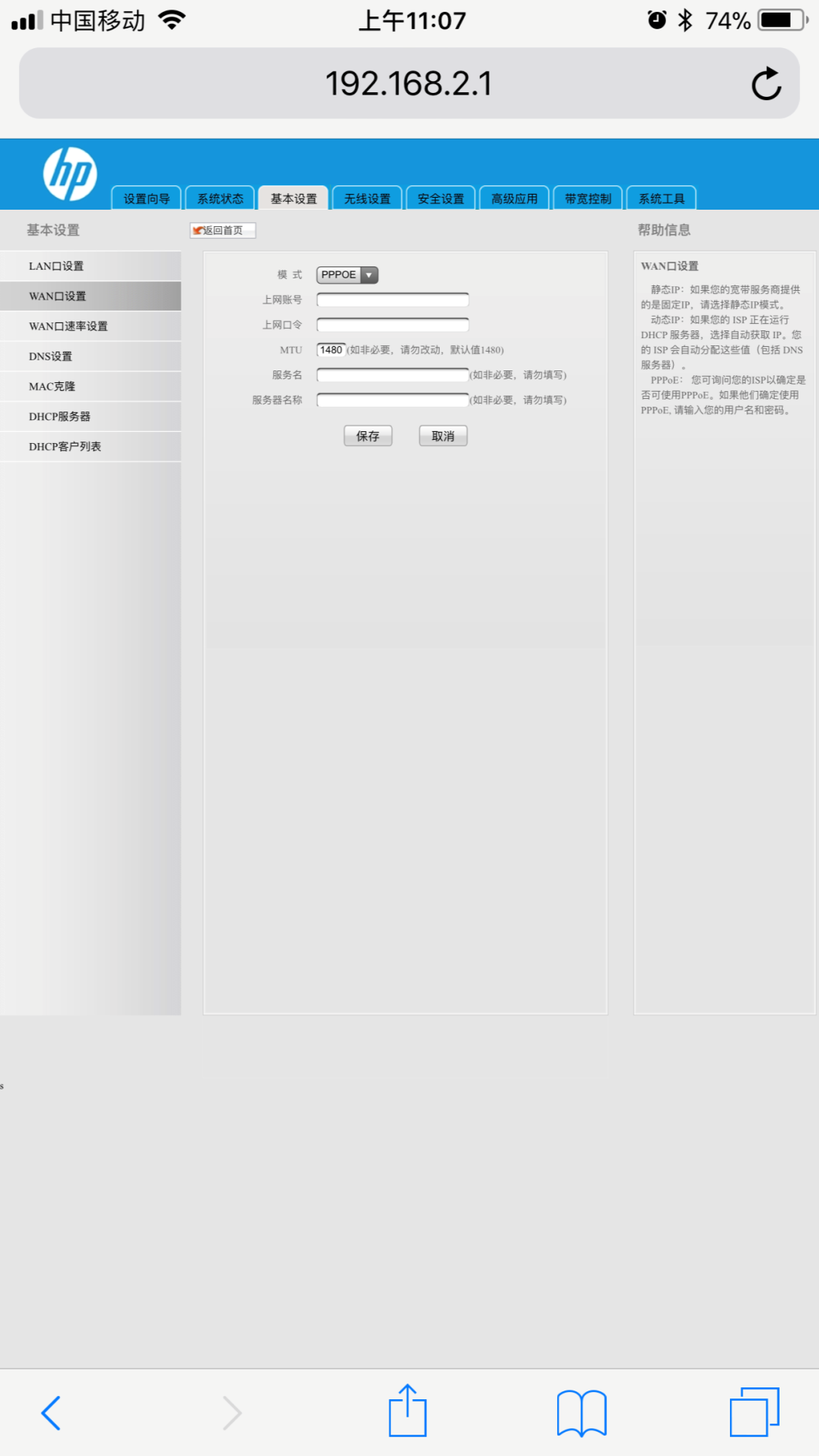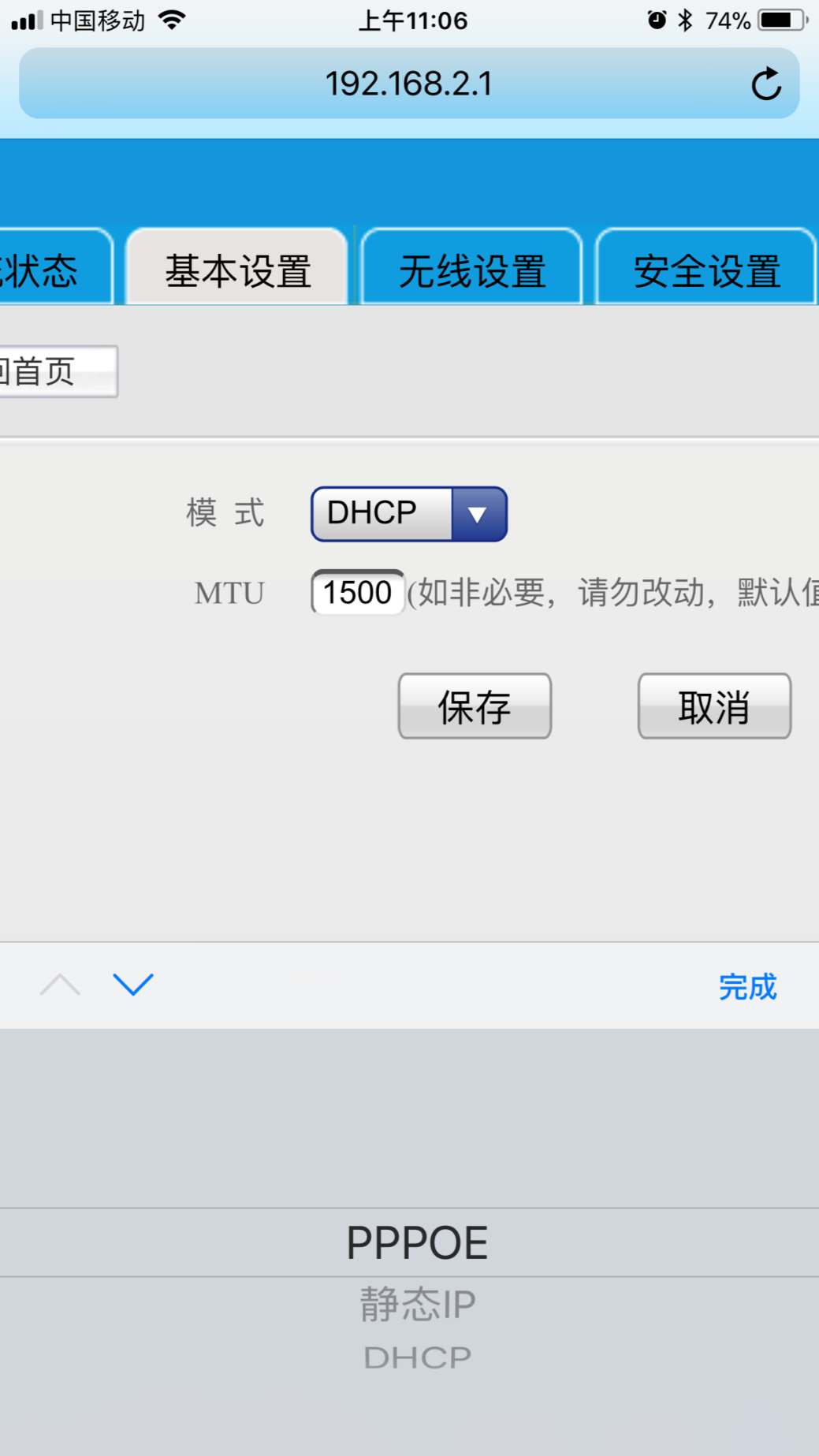 2. 进入路由器设置界面后,选择基本设置中的WAN口设置。模式可以选择DHCP,如果你是宽带用户的话,可以选择PPPOE。