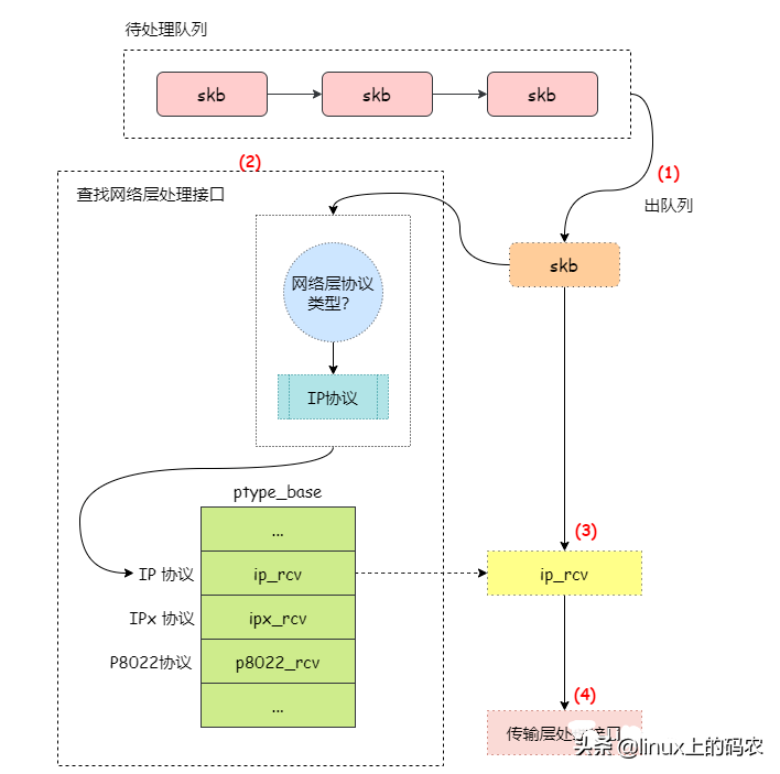 - 现在就非常清晰了,就是根据数据包的网络层协议类型,然后从 ptype_base 数组中找到对应的处理接口处理数据包,如 IP 协议的数据包就调用 ip_rcv 函数处理。