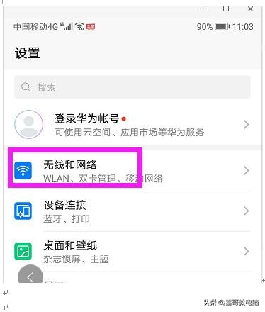 2.点击“设置”图标进入手机设置界面,找到“无线和网络”图标