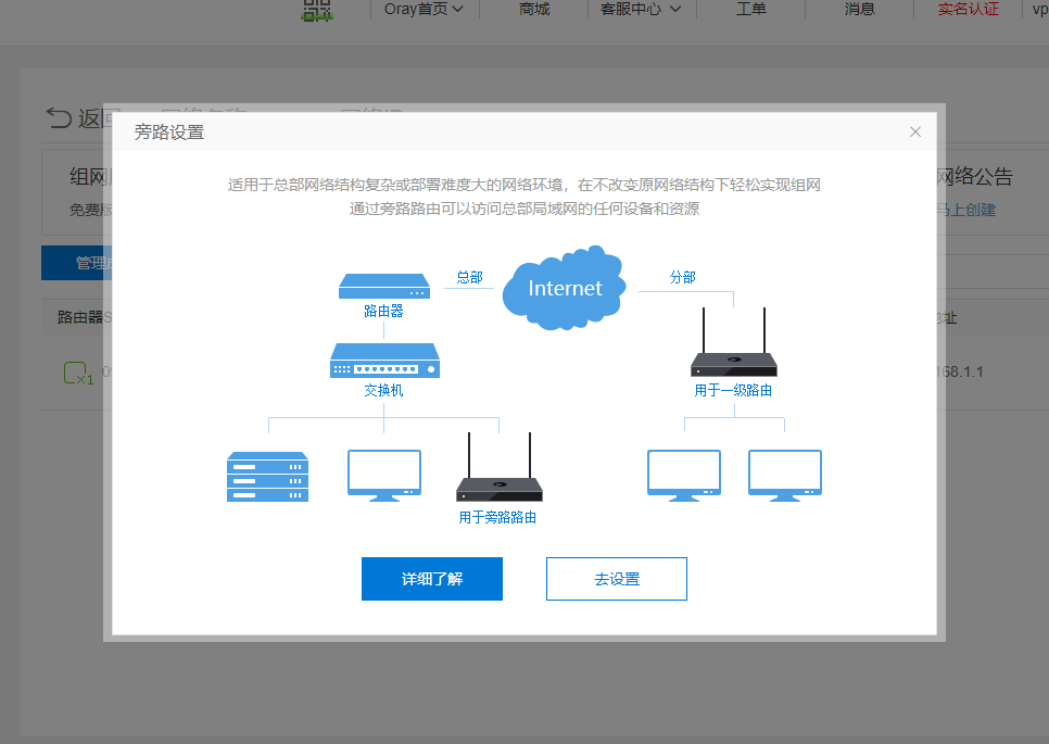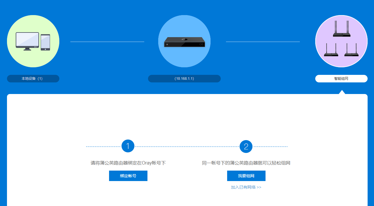 首先,绑定Oray账号。其次,点击“我要组网”,将路由器添加到网络成员中就可建成一个虚拟局域网。之后,蒲公英路由器下方的各个成员即可实现互访。