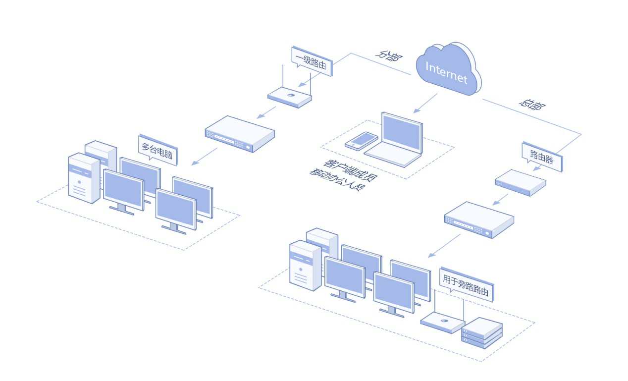 两步完成组网后,只要设置并启用旁路模式,在不改变原有的网络结构的情况下,分公司就能访问总部局域网的任何设备和办公系统了。