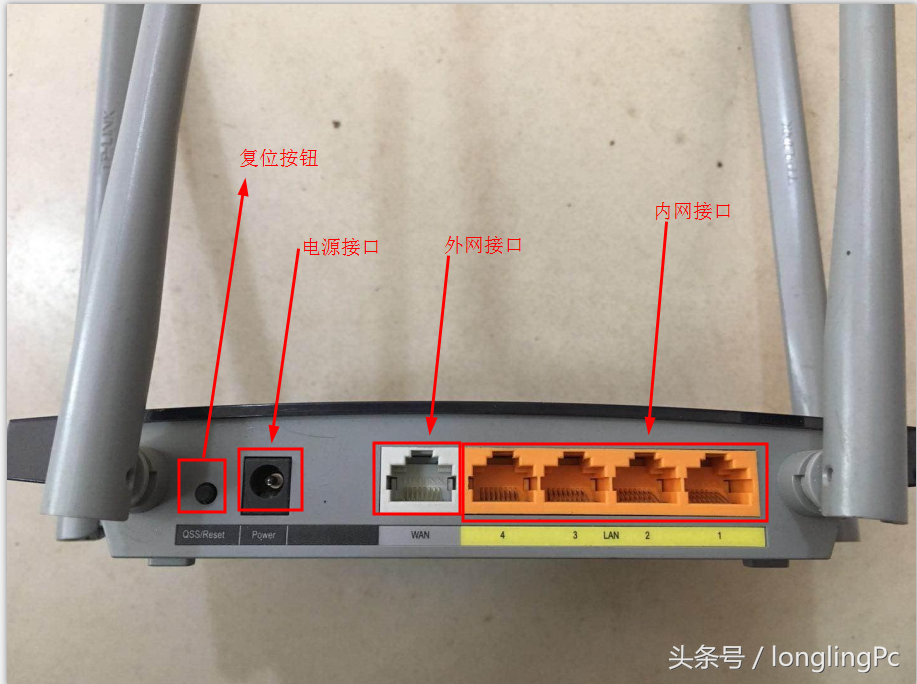 一般的家庭级路由器有5个接口,分别是一个WAN外网口,4个LAN内网口;一个电源接头,一个复位按钮或者复位孔。如下图: