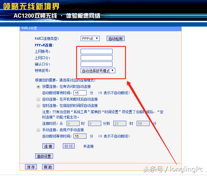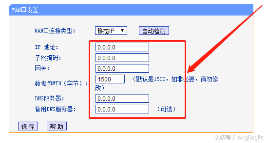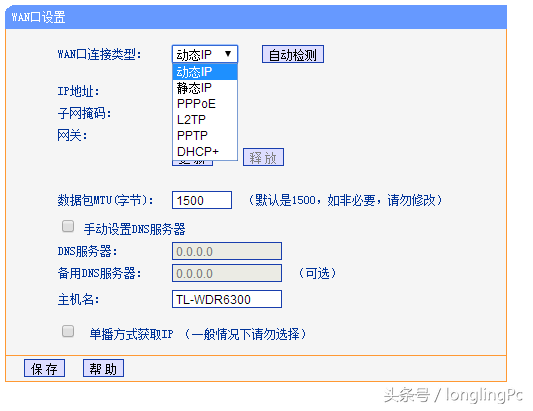 在wan口参数设置中就可以看到刚我们所涉及到的上网的三种方式了,可以根据你的实际情况进行选择,把具体上网参数填写完成后,要注意保存。
