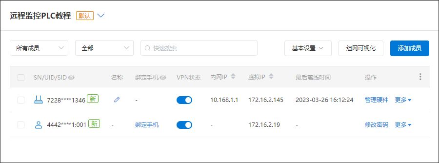 (2)创建蒲公英智能组网成功,可以看到网络内的硬件及软件成员。