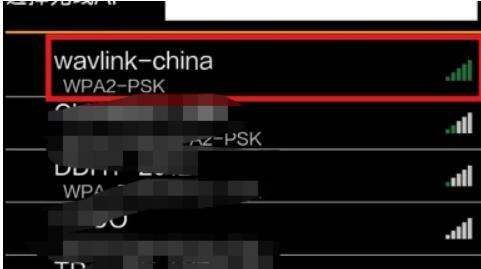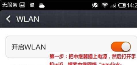 - 通电并连接信号将无线WiFi中继器插上电源,等待第二个“无线信号指示灯”亮起。打开智能手机的WiFi,搜索并连接中继器的初始信号(名称通常为wavlink-repeater)。