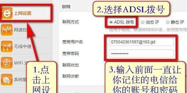 进入“上网设置”,选择ADSL拨号(需输入宽带账号和密码)。