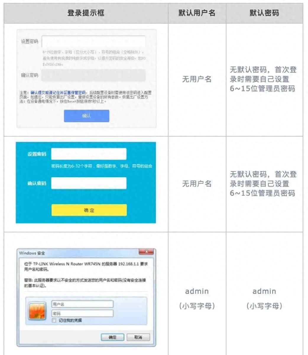 现在主流的TP-LINK路由器分家用和企业用,家用老款的规矩最简单——用户名和密码统统都是admin,厂商在路由器底部贴了标签,不怕你找不到。新一点的家用型号呢,第一次开机登录界面只让你设置密码,没用户名。这个密码通常是6-15位自己设的,谁也不知道它是什么,如果第二次用忘了密码,自己都懵了。