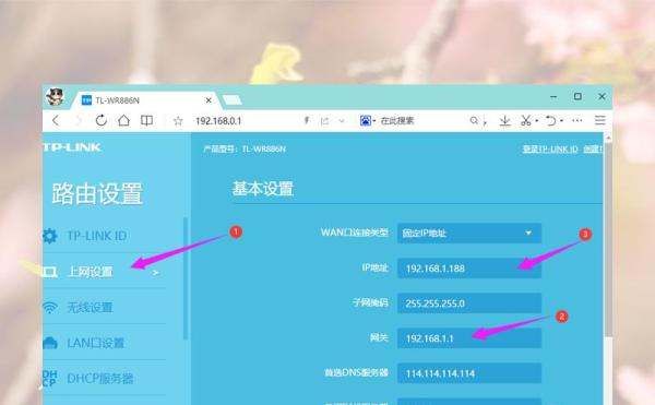 - 查看光猫IP地址(网关)在管理界面点击“路由设置”,进入“上网设置”选项卡,查看“网关”地址(即光猫的IP主地址)。关键操作:将路由器IP地址的第四位数字修改为除1以外的其他数字(如192.168.1.2或192.168.1.188),且数值需在200以内。