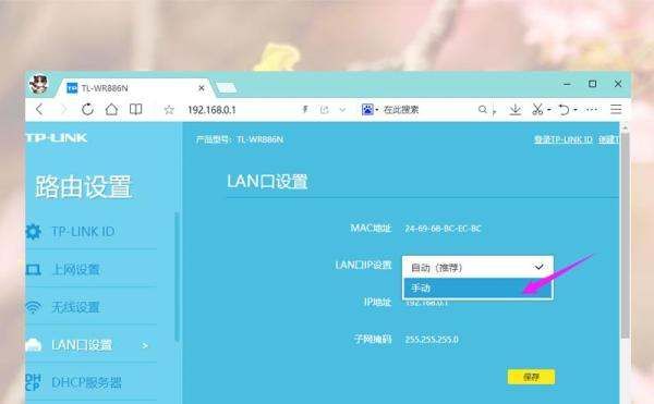 将“LAN口IP设置”选项框选择为“手动”,此时可修改路由器IP地址。